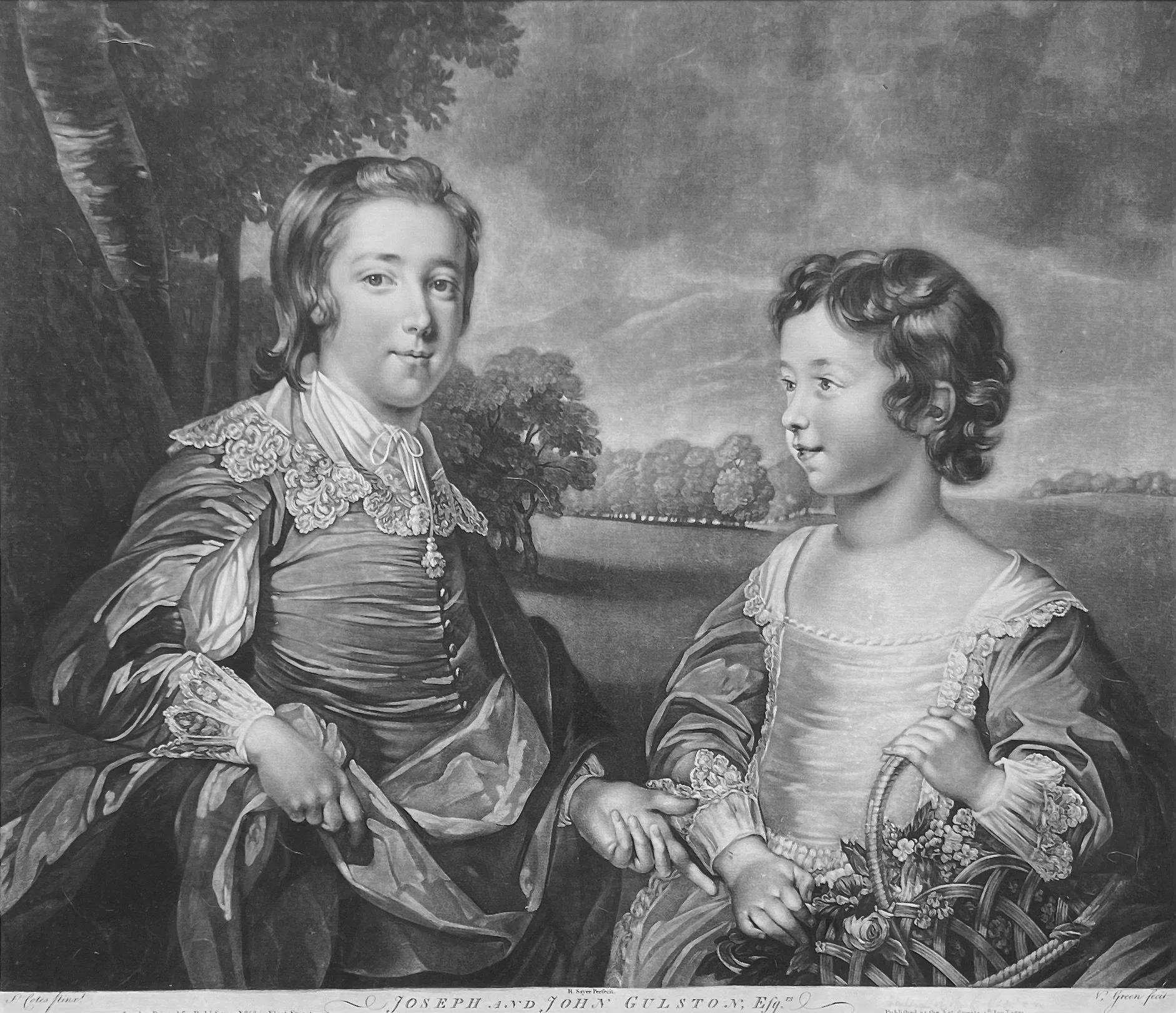 A fine, large and rare 18th century double mezzotint portrait mezzotint of Masters Joseph and John Gulston by Valentine Green after Francis Cotes.